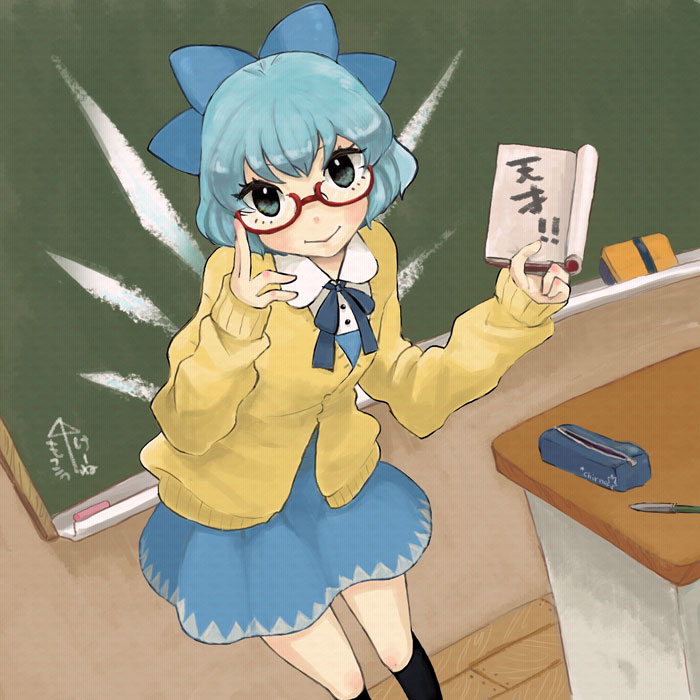 1girladjusting eyewearai ai gasabespectacledblack socksboard erasercardiganchalkboarddressfemale focusglassespodiumshort hairskirtsmilesockssolo