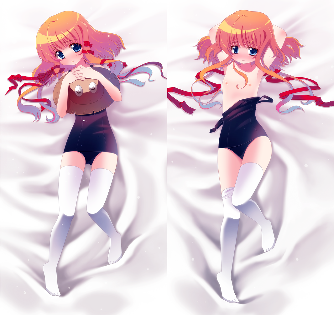 1girlarms behind headblue eyesblushclothes pulldakimakura (medium)feetfemale focusflat chesthair ribbonhatlolilong hairlyingmultiple viewson backone-piece swimsuitone-piece swimsuit pullorange hairribbonschool swimsuitswimsuitthighhighsundressingwhite thighhighs