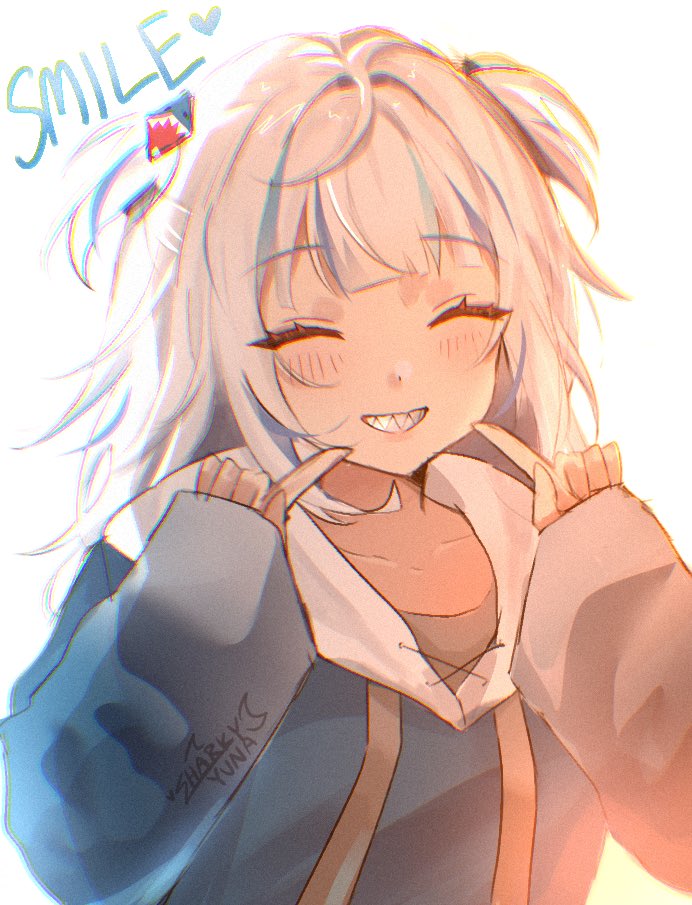 1girlblue hoodieblue streaksblushchoppy bangsclosed eyesdrawstringfacing viewerhair ornamenthands uphoodhood downhoodielong hairlong sleevesmulticolored hairpointingpointing at selfsharp teethsimple backgroundsleeves past wristssmilesolostreaked hairteethtwo side upupper bodyvirtual youtuberwhite background
