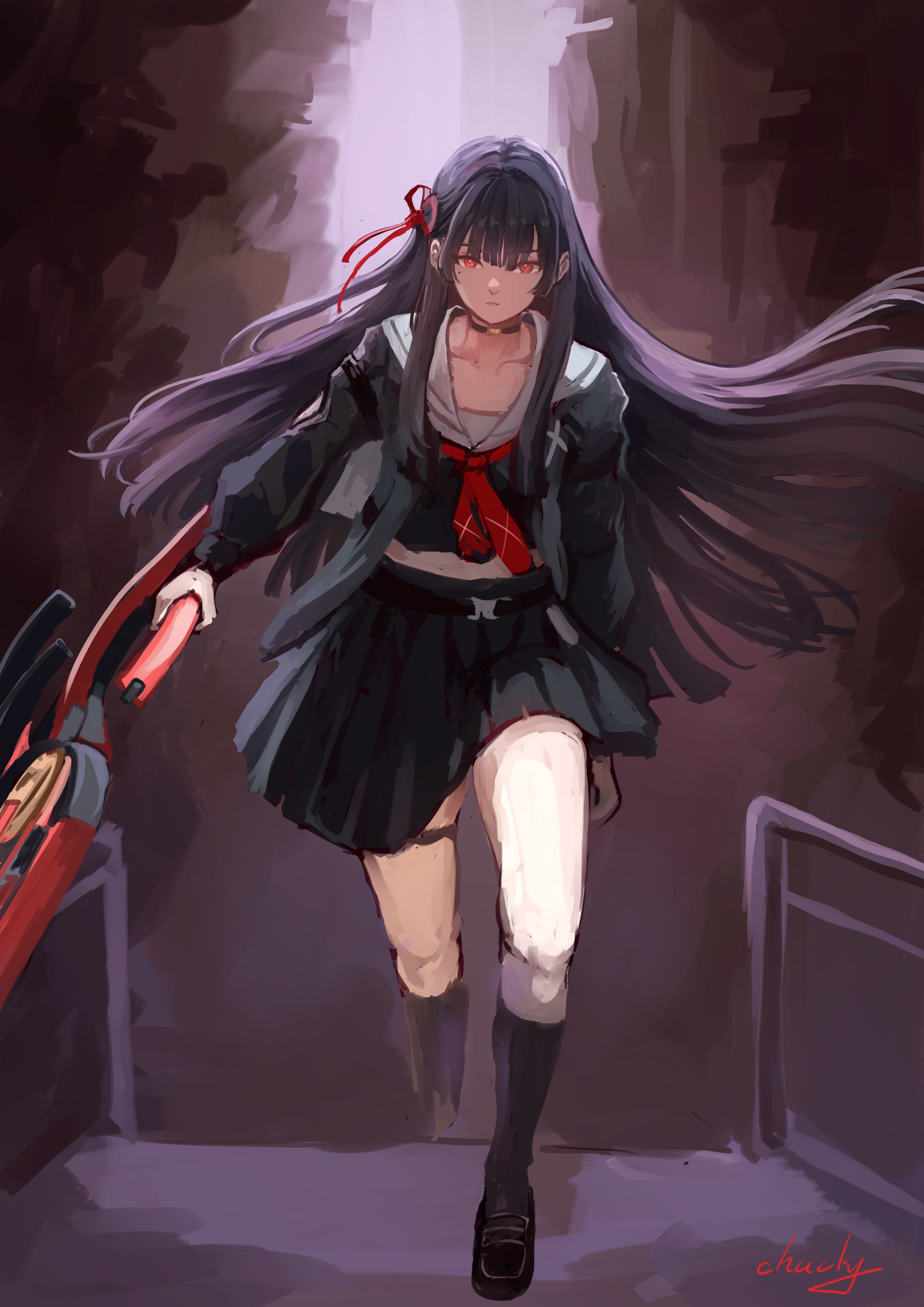 1girlblack chokerblack hairblack jacketblack serafukublack shirtblack skirtchokerclosed mouthcollarbonecrop tophair ribbonholdingholding swordholding weaponjacketloaferslong hairlong sleeveslooking at viewermolemole under eyeneckerchiefred eyesred neckerchiefred ribbonribbonsailor collarschool uniformserafukushirtshoessignatureskirtsoloswordweaponwhite sailor collar