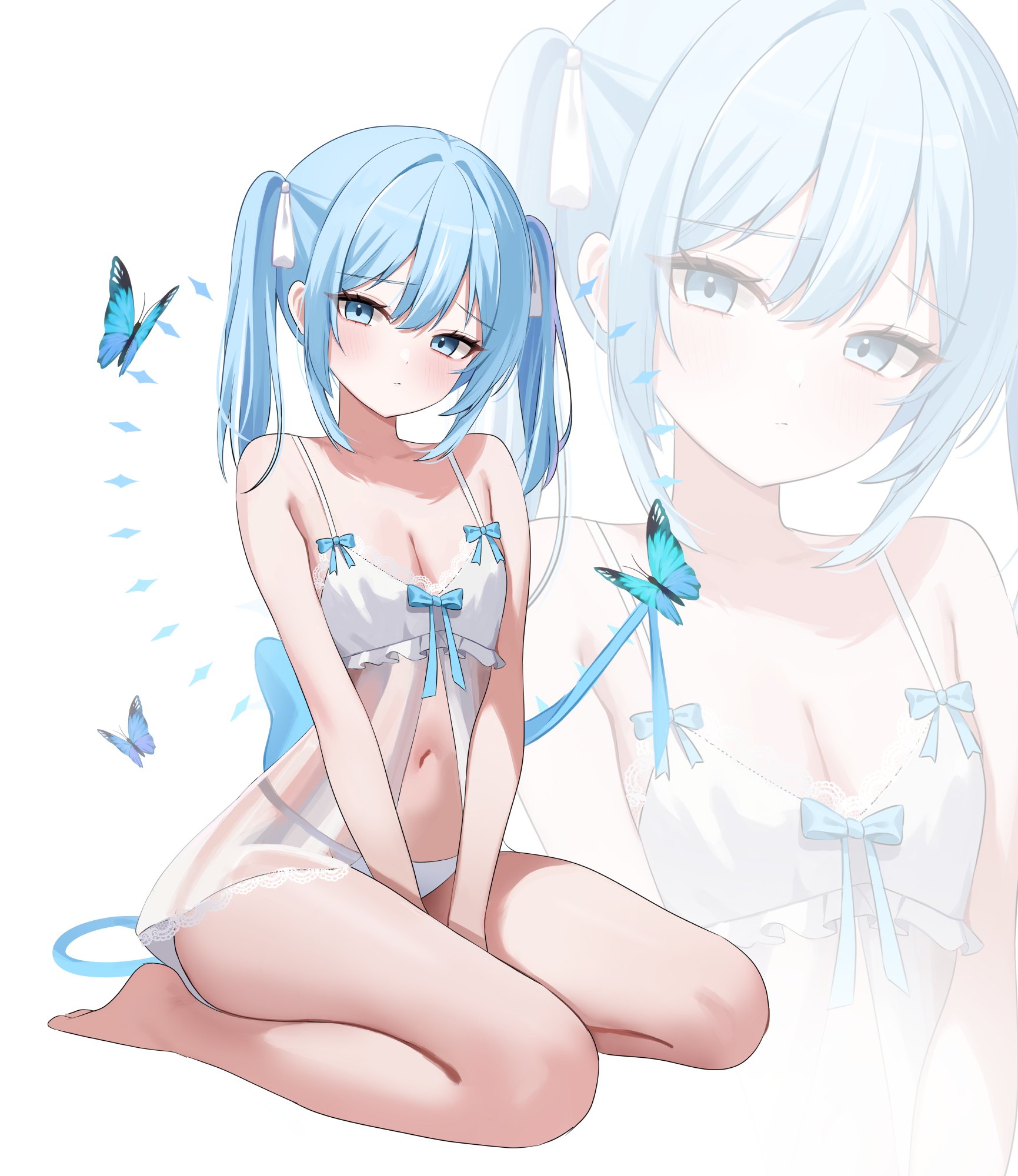 1girlbabydollbare armsbare legsbare shouldersbarefootblue eyesblue hairbreastsbugbutterflycleavagefull bodyinsectlong hairlooking at viewernavelpantiesseizasimple backgroundsittingsmall breastssolospaghetti strapstomachthighstwintailsunderwearvirtual youtuberwhite babydollwhite backgroundwhite pantieszoom layer