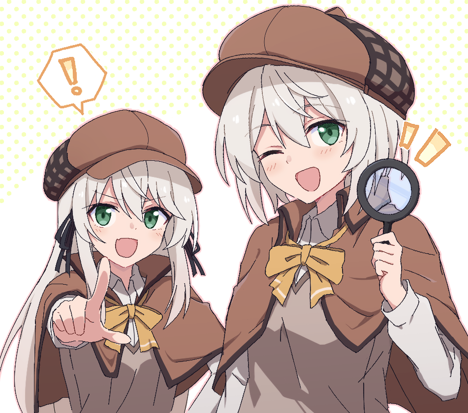 :d1boy2girlsblushbowbowtiebrown capeletbrown hatcapeletcollared shirtgreen eyesgrey hairgrey vesthatholdingholding magnifying glasslong sleeveslooking at viewermagnifying glassmultiple girlsnewsboy capnotice linesone eye closedopen mouthoutlinepink outlinepolka dotpolka dot backgroundshirtshort hairsmilespoken exclamation markupper bodyvestwhite shirtyellow bowyellow bowtie