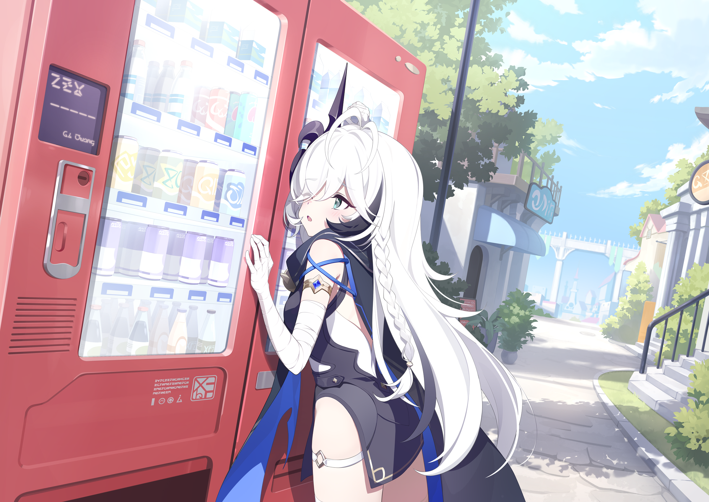 1girlantenna hairbackless dressbackless outfitbandaged armbandagesbare shouldersblack capeblack dressblack hairblue eyesblue skycancapecloudcosette (stella sora)cowboy shotdaydressdrink caneyes visible through hairhair over one eyelooking at viewero-ringo-ring thigh strapone eye closedopen mouthoutdoorsskysleevelesssleeveless dresssoda cansolothigh strapvending machinewhite hair