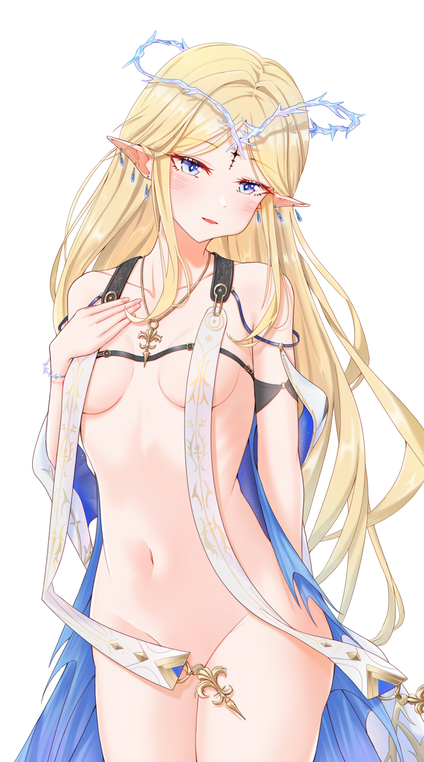 1girlblonde hairblue eyesbreastscollarboneconvenient censoringcowboy shotcrown of thornsearringshand on own chestjewelrylight blushlight smilelong hairlooking at viewermedium breastsmultiple earringsnavelnecklacenudeparted bangsparted lipspointy earssidelockssolostomachtacet mark (wuthering waves)thighsvery long hair