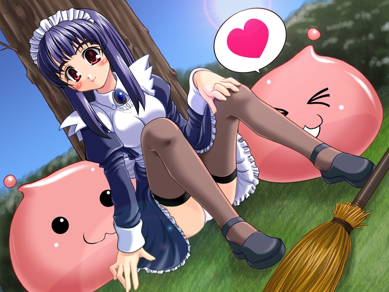 1girlblue hairblushbroochbroomfemale focusheartjewelrylong hairmaidpantiespantyshotred eyessolospoken heartthighhighstongueunderwearwhite panties