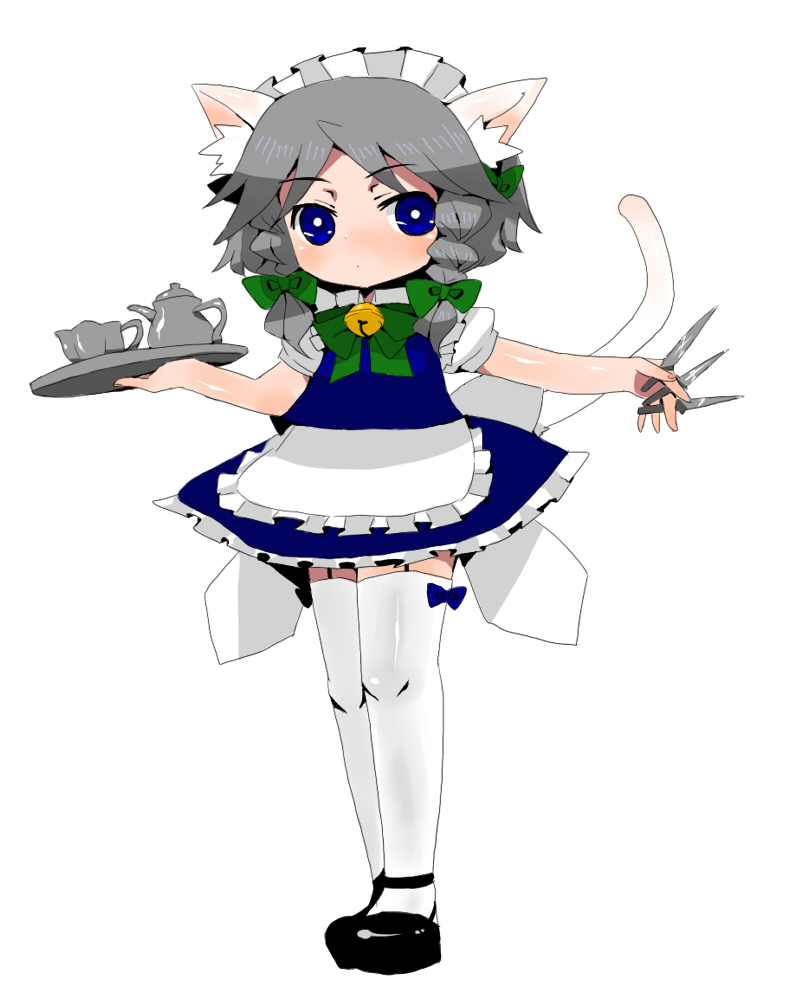 1girlanimal earsbellblue eyesbowbraidcat earscat girlcat tailfemale focusgrey hairhair bowhairbandjingle bellkettleknifeshort hairsimple backgroundsolotailthighhighsthrowing knifetraytwin braidsweaponzettai ryouiki