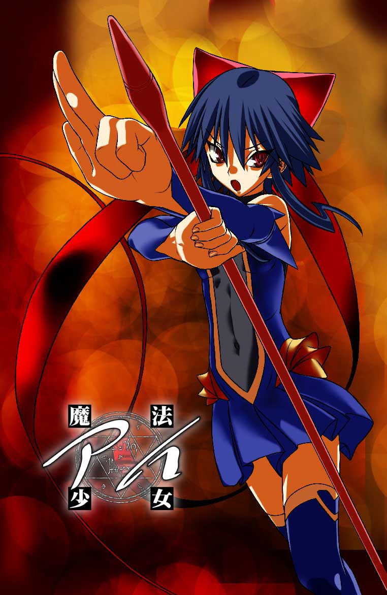 00s1girlbare shouldersblue hairdetached sleevesfemale focusflat chesthair ribbonmagical girlpurple thighhighsred eyesribbonshort hairsolostaffthighhighs