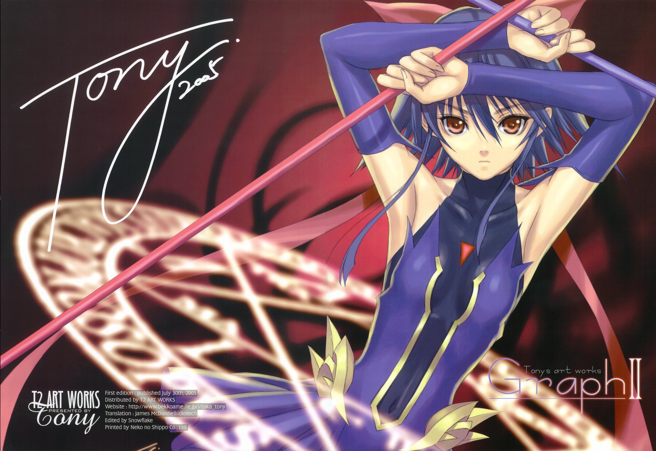 00s1girl2005armpitsarms upbare shouldersblue hairbrown eyescollarbonedetached sleevesdual wieldingfemale focusflat chesthair ribbonholdinglooking at viewermagic circlemagical girlred eyesribbonshadowshort hairsignaturesolostaffturtleneck