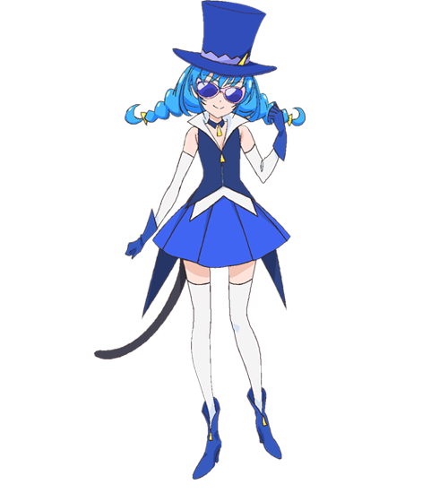1girlblue bootsblue glovesblue hairblue hatblue shirtblue skirtbootsbraidcat tailfull bodygloveshand uphatlong hairpleated skirtshirtsimple backgroundskirtsmilesolostandingsunglassestachi-etailthighhighstop hattransparent backgroundtwin braidswhite thighhighs