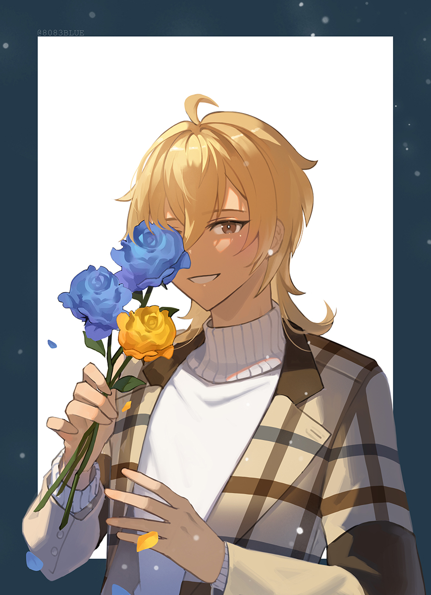 1boyblonde hairblue borderblue flowerblue roseborderbrown eyesbrown jacketflowerflower over eyegrinjacketlight particleslong sleeveslooking at viewermale focusrosesmilesolosweaterwhite sweateryellow floweryellow rose