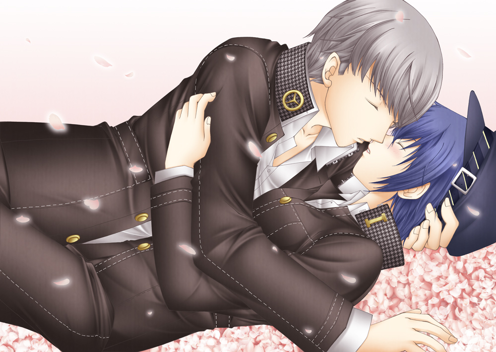 1boy1girlblue hairblushclosed eyescouplehatheterohugimminent kisskisslyingnewsboy capopen mouthpetalsreverse trap