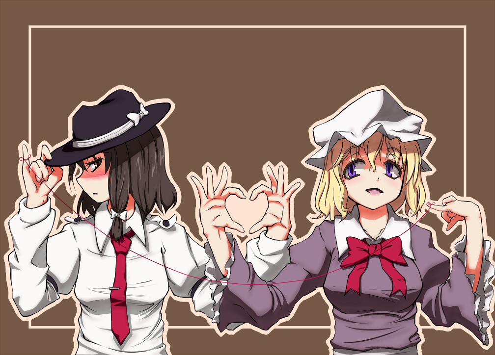 2girlsblonde hairblushbrown hairfedorafemale focusformal clothesfour-finger heart handshatheartheart handsheart hands duomultiple girlsnecktiepurple eyesribbonstringstring of fate