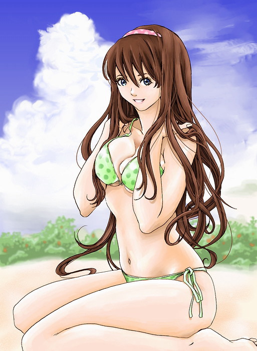 1girlbeachbikiniblue eyesbrown hairclouddayfemale focuslong hairoutdoorsside-tie bikini bottomsittingsoloswimsuit