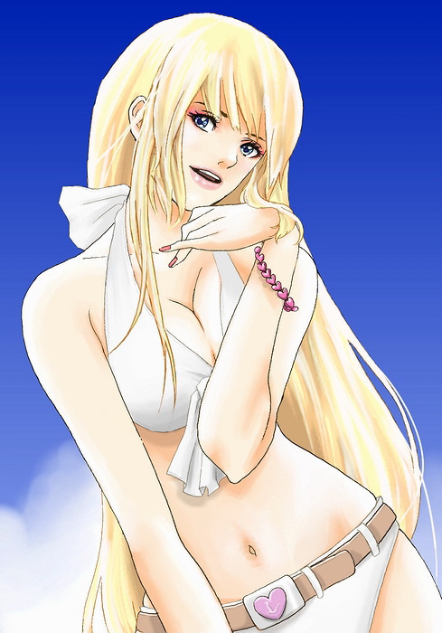 1girlbikiniblonde hairblue eyesbreastscleavageeyeshadowheartlarge breastslong hairmakeupmidriffnail polishpink nailssmileswimsuitvery long hair