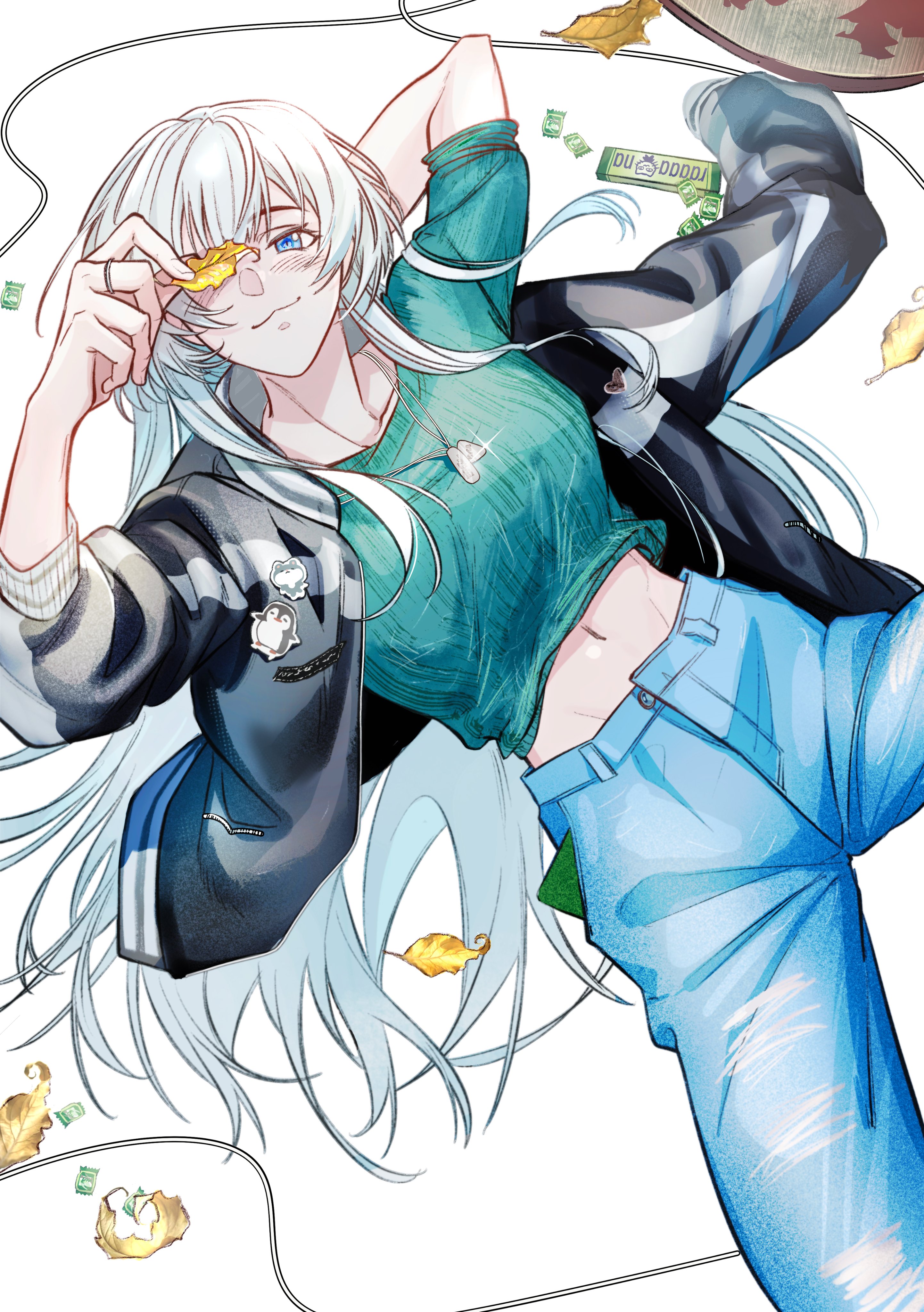 xm (rvgj8487), yixuan (trails of ink) (zenless zone zero), yixuan (zenless zone zero), zenless zone zero, absurdres, highres, 1girl, ahoge, arms up, back-seamed legwear, black jacket, black pantyhose, black unitard, blue flower, blue rose, bodystocking, boutonniere, breasts, dress over shirt, flower, flower on chest, frilled leotard, frills, hair ornament, hand in own hair, jacket, large breasts, leotard, long hair, long sleeves, official alternate costume, pantyhose, parted lips, rose, seamed legwear, single hair intake, skirt, solo, very long hair, white hair, yellow eyes