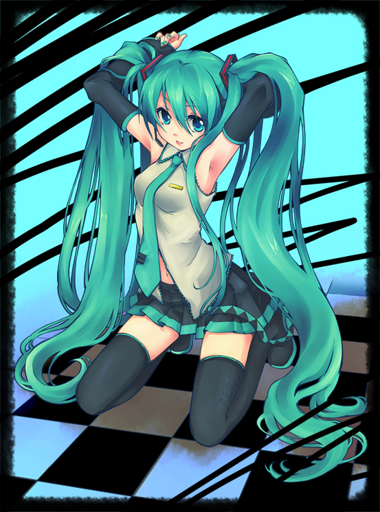 1girlaqua hairarmpitsbootscheckered floordetached sleevesfemale focusgreen nailslong hairnail polishnavelperspectiveskirtsolothigh bootsthighhighstwintails