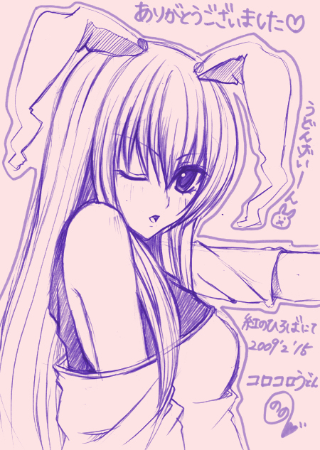 1girlanimal earsfemale focuslong hairmonochromeone eye closedpink backgroundpurple themerabbit earsshikishisolowink