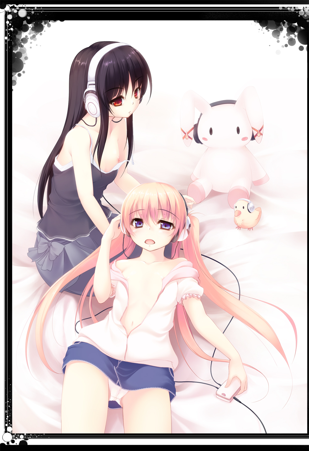 :d2girlsbirdblack hairblonde hairblue eyesdenimdenim skirtflat chestheadphoneslap pillowlong hairlyingmultiple girlsnipple slipnipplesopen clothesopen mouthopen shirtorange eyespantiespantyshotshirtskirtstuffed animalstuffed rabbitstuffed toytwintailsunderwear