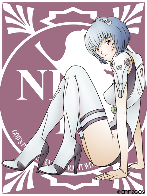 1girladapted costumeartist nameblue hairbootsbreastsdatedenglish textfemale focusfrom sidefull bodyhead tilthigh heel bootshigh heelsknees uplegsleotardlight smilelogolooking at viewerlooking backmecha pilot suitnervplugsuit (evangelion)purple backgroundred eyesshoesshort hairsittingsmilesolothighhighswhite bootswhite thighhighs