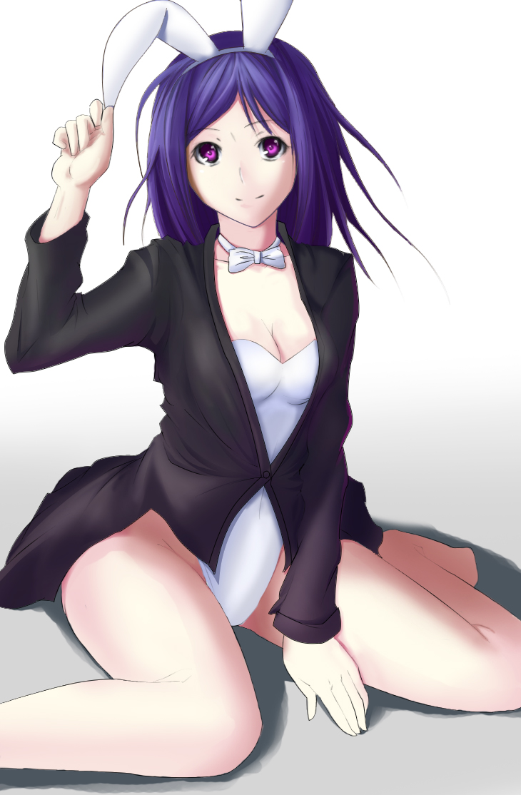 1girlanimal earsbare legsblue hairfake animal earsfemale focusplayboy bunnypurple eyesrabbit earsshort hairsolotuxedo jacket