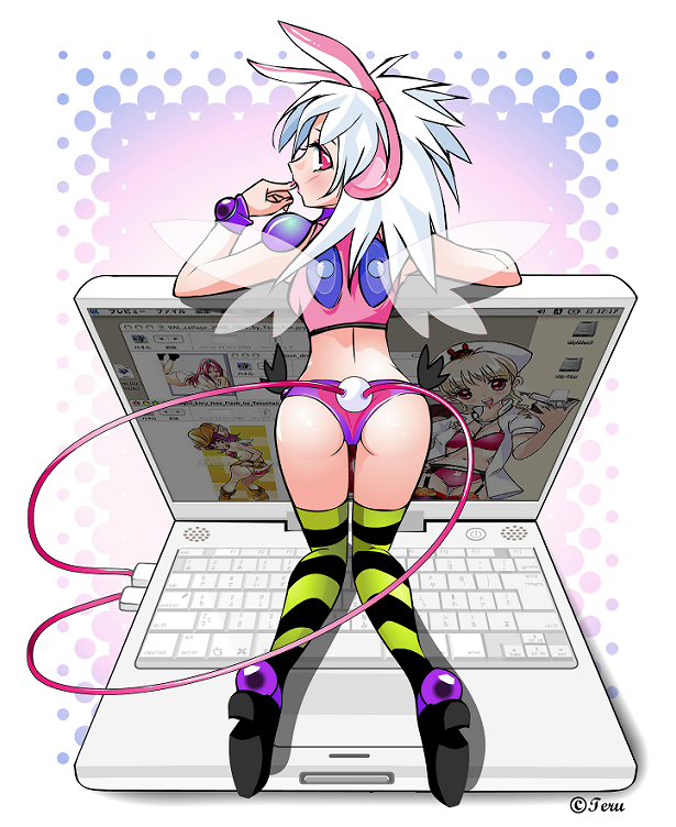 androidanimal earsasscomputercomputer keyboardibooklaptoprabbit earsred eyessolothighhighswhite hairwings