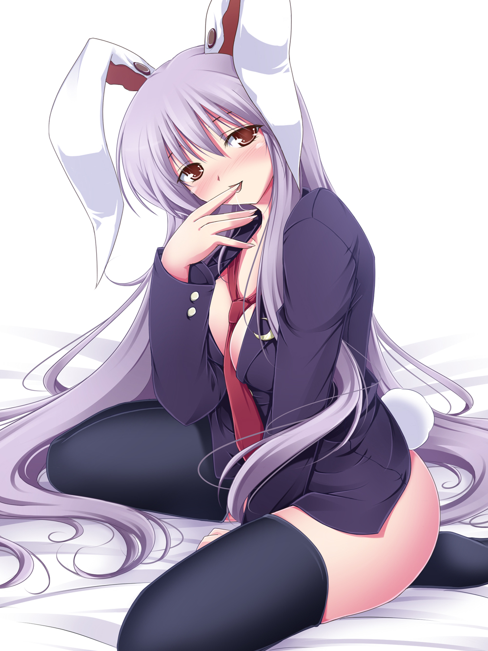 :p1girlanimal earsblack thighhighsblazerblushbottomlessbreastscleavagefemale focusjacketlarge breastslong hairmoonnecktiepurple hairrabbit earsrabbit girlrabbit tailred eyesred necktiesittingsolotailthighhighstonguetongue outvery long hair
