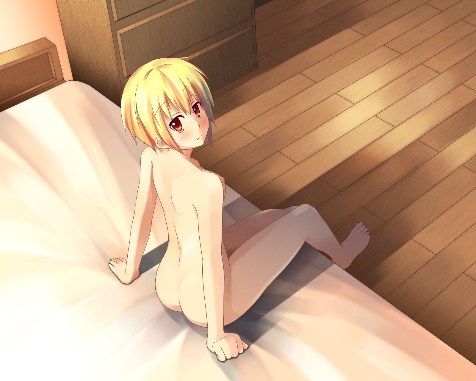 1girlassbarefootbedblonde hairbreastsfeetfemale focusfrom abovelooking upmedium breastsnudered eyesshort hairsittingsolotoes