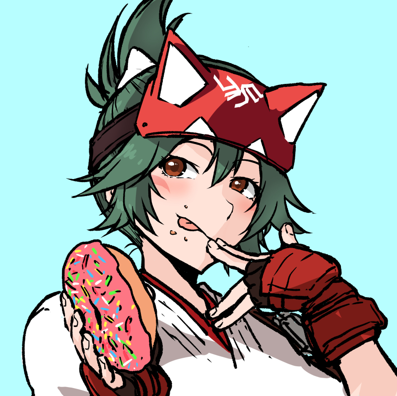 1girlblue backgroundbowbrown eyesclosed mouthcrumbsdonuteatingfacial markfingerless glovesfoodfood on facefox maskglovesgreen hairhair between eyeshair bowhalf maskholdingholding donutholding foodjapanese clotheskimonolicking lipslooking to the sidemaskmask on headred glovesshort hairsimple backgroundsmilesolotonguetongue outtopknotupper bodywhite bowwhite kimono
