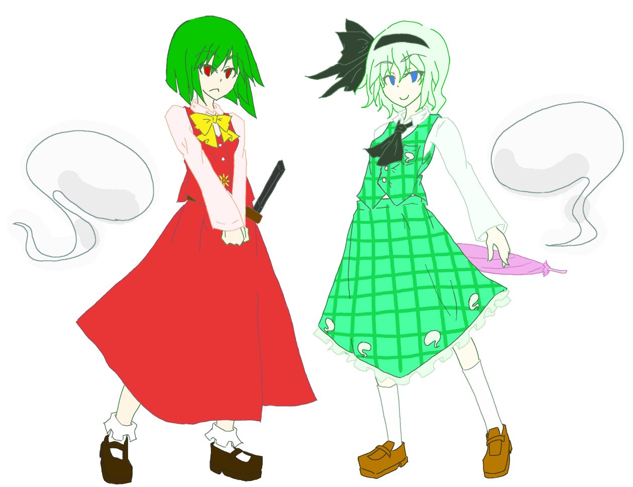 2girlsascotblue eyesclosed umbrellafemale focusflowerfrownghostgreen eyesgreen hairhairbandhitodamaif they matedkatanaloafersmary janesmultiple girlsred eyesshoesshort hairsimple backgroundskirtskirt setsmileswordumbrellav armsvestweaponwhite background
