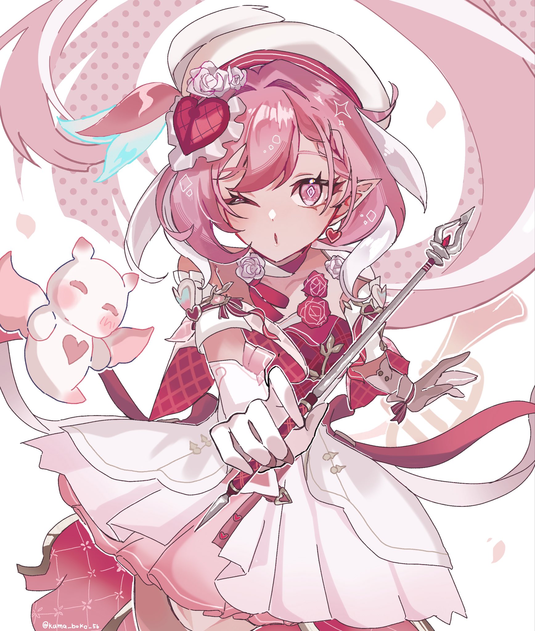 1boy1girlberetta 92breastsdiamond (shape)diamond-shaped pupilsdressearringselfglovesgunhandgunheartheart earringsholdingholding wandjewelrykama boko 56large breastslong hairmulticolored hairone eye closedpink hairpointy earspurple eyesred dresssmilesymbol-shaped pupilstwo-tone dresstwo-tone hairvery long hairwandweaponwhite dresswhite gloveswhite hair
