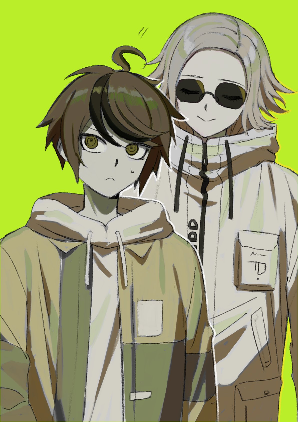1boy2boysahogeasakamo sirenaibreast pocketclosed eyesfacing viewerfrowngreen backgroundgreyscale with colored backgroundhoodhoodiejacketjacket over hoodielooking at viewermale focusmulticolored hairmultiple boysopen clothesopen jacketpocketshort hairstreaked hairsunglassessweatdrop