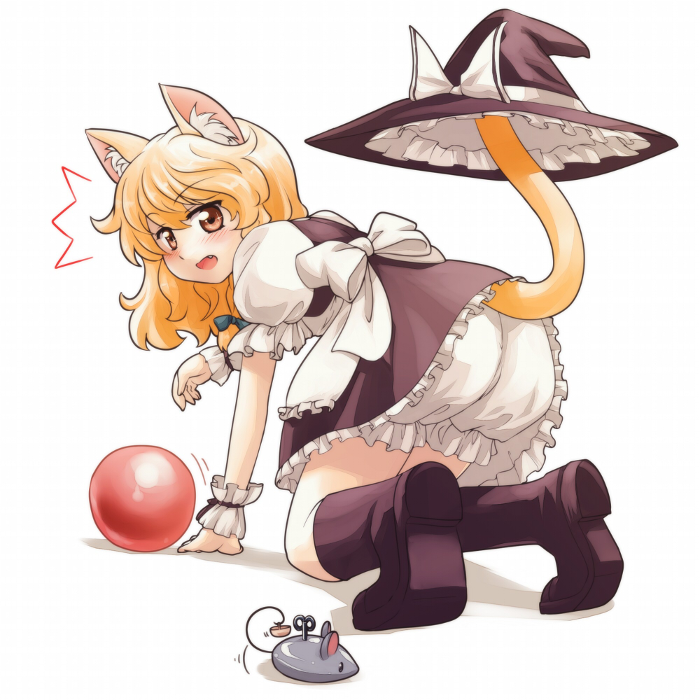 1boy1girlall foursanimal earsballblonde hairbloomerscat earscat girlcat tailfangfemale focushatholdingholding with tailkemonomimi modelooking backprehensile tailsolotailtoy mouseunderwearunworn hatunworn headwearwitchwitch hatwrist cuffsyellow eyes
