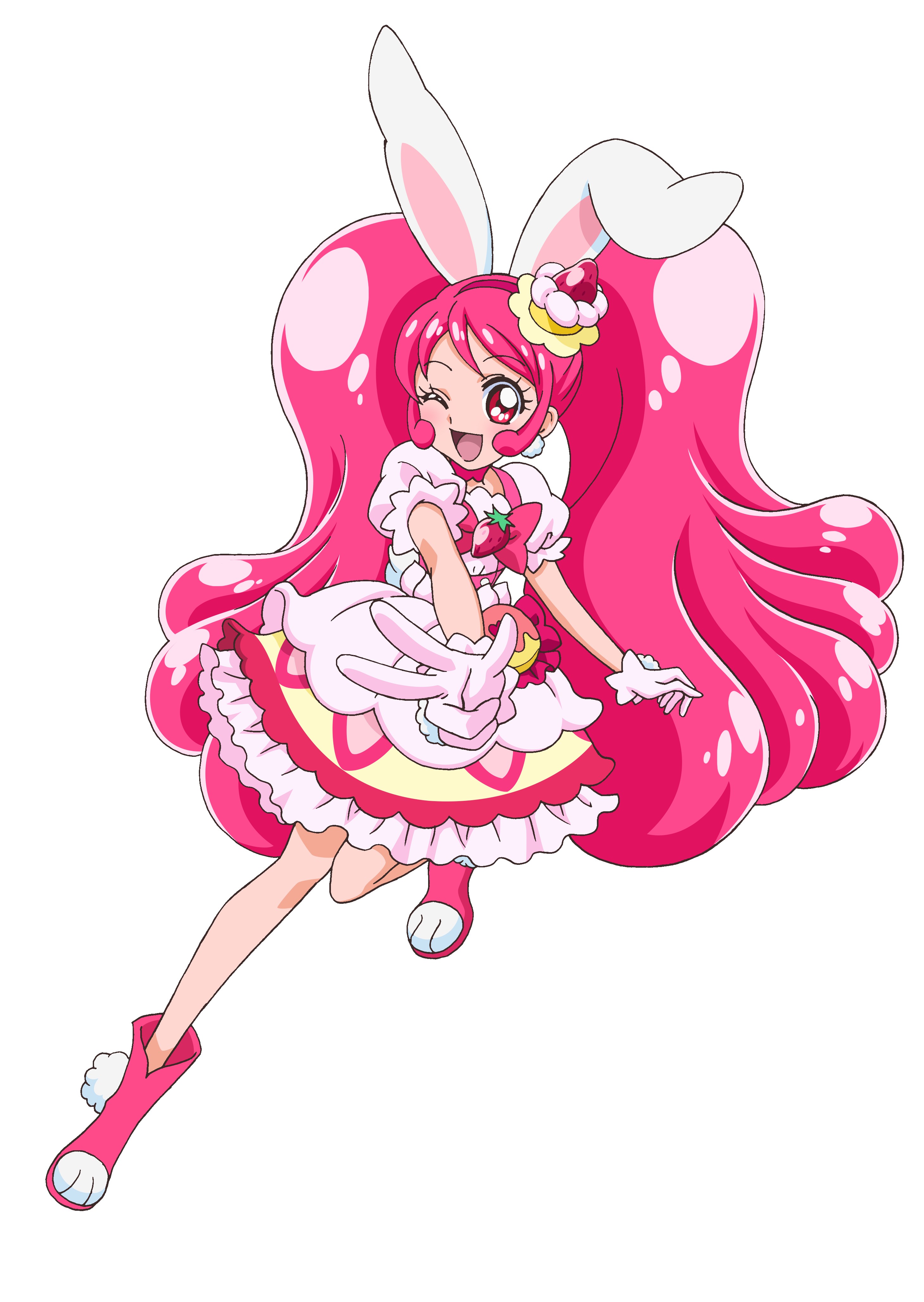 1girlanimal earsbootscake hair ornamentchokerdressearringsextra earsfoodfood-themed hair ornamentfrilled dressfrillsfruitfull bodygloveshair ornamentjewelrylong hairlooking at viewermagical girlone eye closedopen mouthpaw shoespink bootspink chokerpink dresspink eyespink glovespink hairpom pom (clothes)pom pom earringspuffy short sleevespuffy sleevesrabbit earsshort sleevessimple backgroundsmilesolostandingstanding on one legstrawberrytransparent backgroundtwintailswwhite gloves