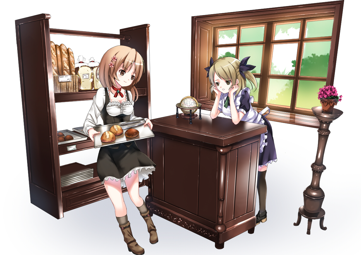 2girlsapronbakeryboredbreadbrown hairflowerfoodhead restmaidmaid apronmultiple girlsribbonshopskirttwintails