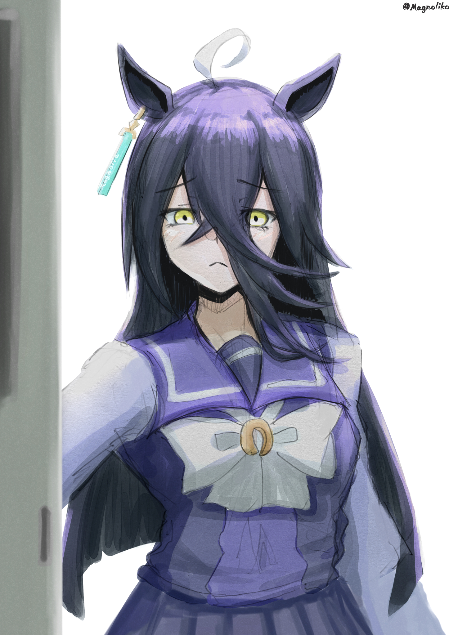 1girlahogeanimal earsblack hairbowbowtiebreastsclosed mouthear tagearringsfrownhair between eyeshorse earshorse girljewelrylong bangslong hairlong hair between eyeslong sleeveslooking at viewermulticolored hairpurple sailor collarpurple serafukupurple shirtpurple skirtsailor collarsailor shirtschool uniformserafukushirtsingle earringskirtsolotracen school uniformvery long hairwhite bowwhite bowtiewhite hairyellow eyes
