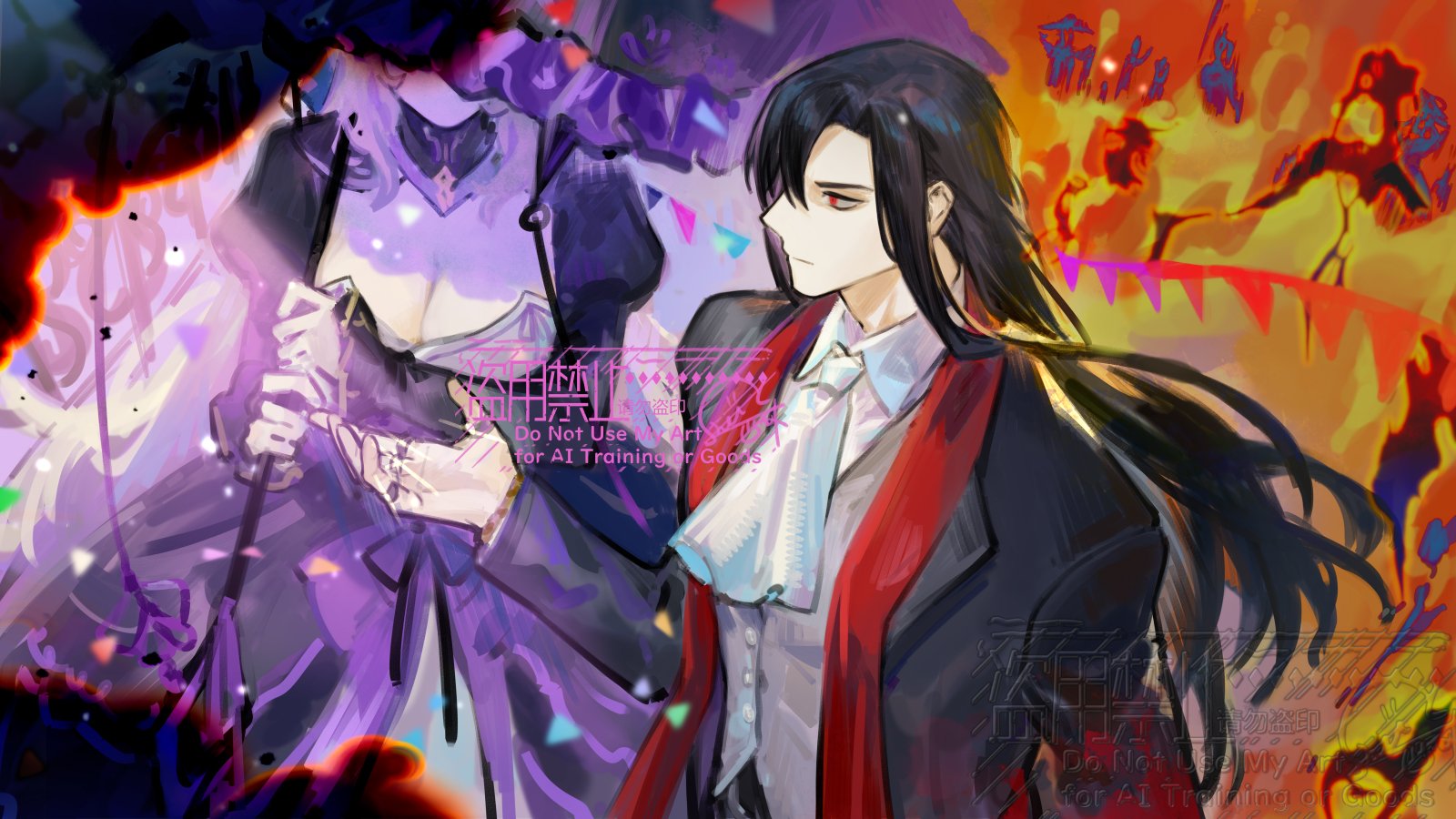 1boy1girlblack coatblack hairblonde hairbreastsbuntingburningcleavagecoatcollarcollared shirtconfettidressfirefrillshair flowing overholdingholding umbrellalight particlesout of frameoutstretched handparasolpurple dressred eyesred scarfscarfshirtsilhouetteumbrellaupper bodyvestwhite vest