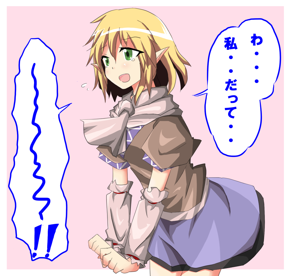 1girlarm warmersblonde hairbrown shirtfemale focusgreen eyesoutside borderpink backgroundpointy earsshirtsolospeech bubbletears