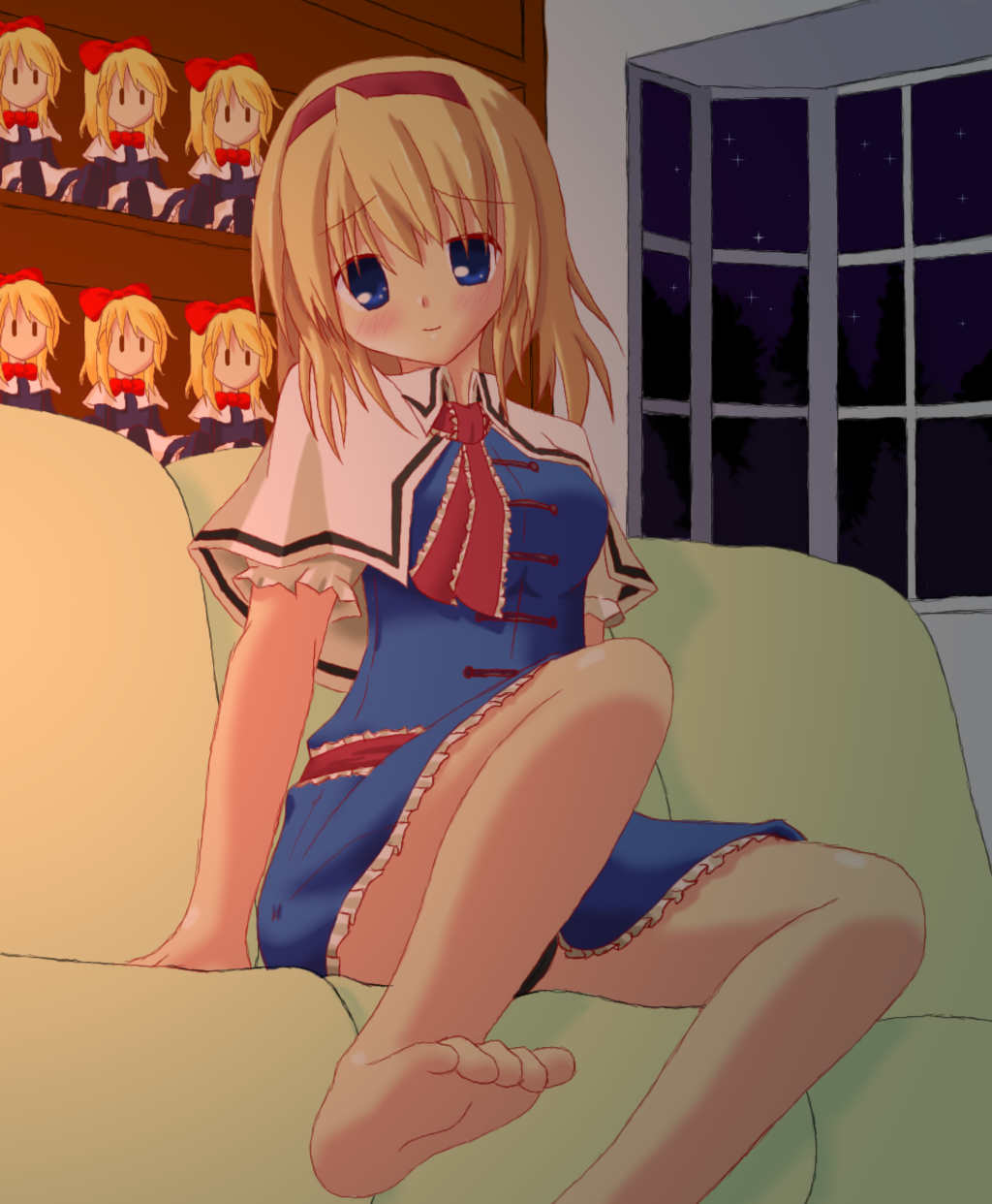 hayama riko, 1girl, blonde hair, blue eyes, bottomless, female focus, lying, open clothes, open shirt, ribbon, shirt, solo