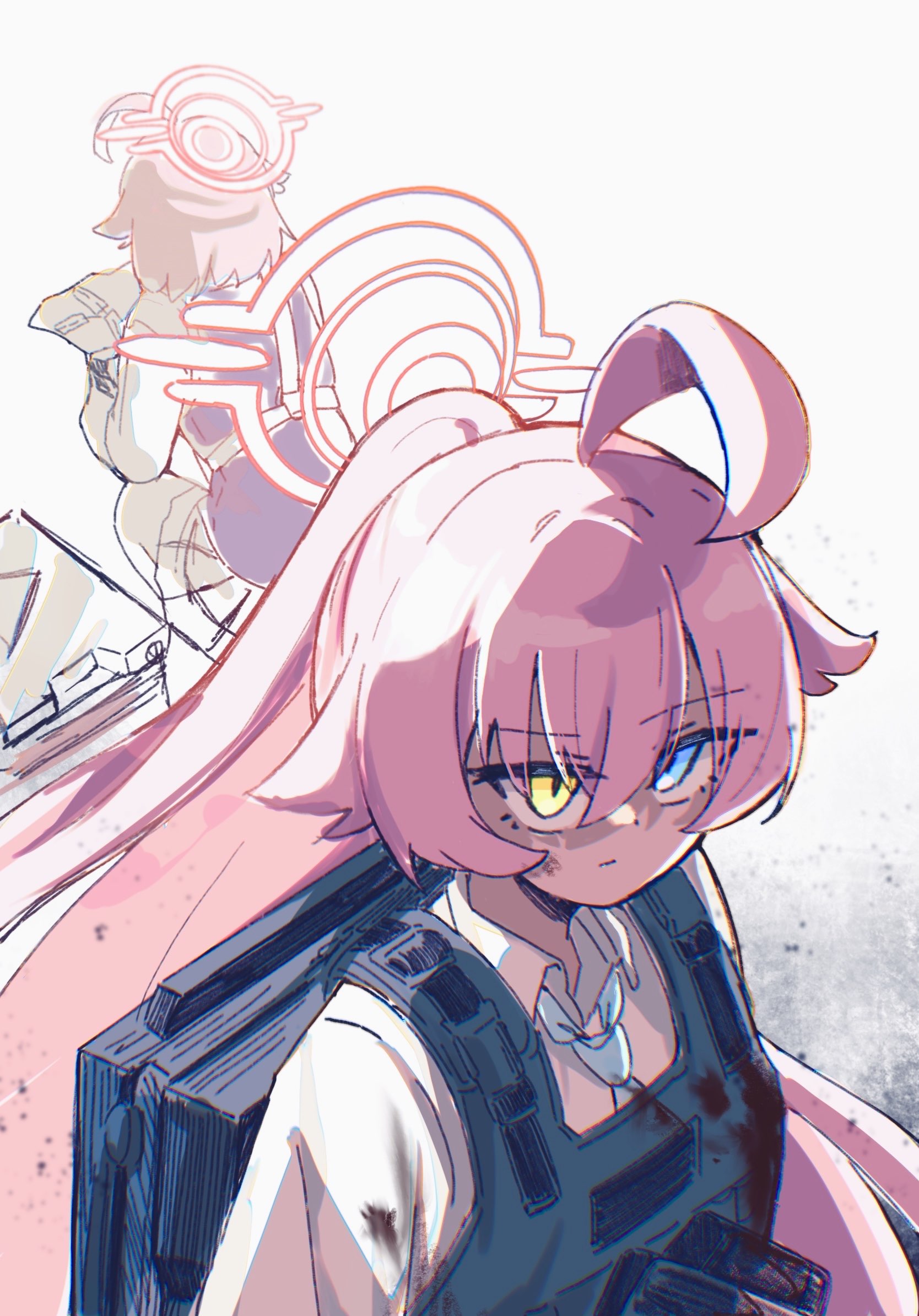 ahogebloodblood on clothesblue eyesblue necktieclosed mouthcollared shirtfeet out of framefrom behindhair between eyeshaloheterochromiaholdinghuge ahogelong hairnecktiepink hairpink haloponytailschool uniformshieldshirtskirtsquattingtactical school uniformupper bodyvestwhite shirtyellow eyes