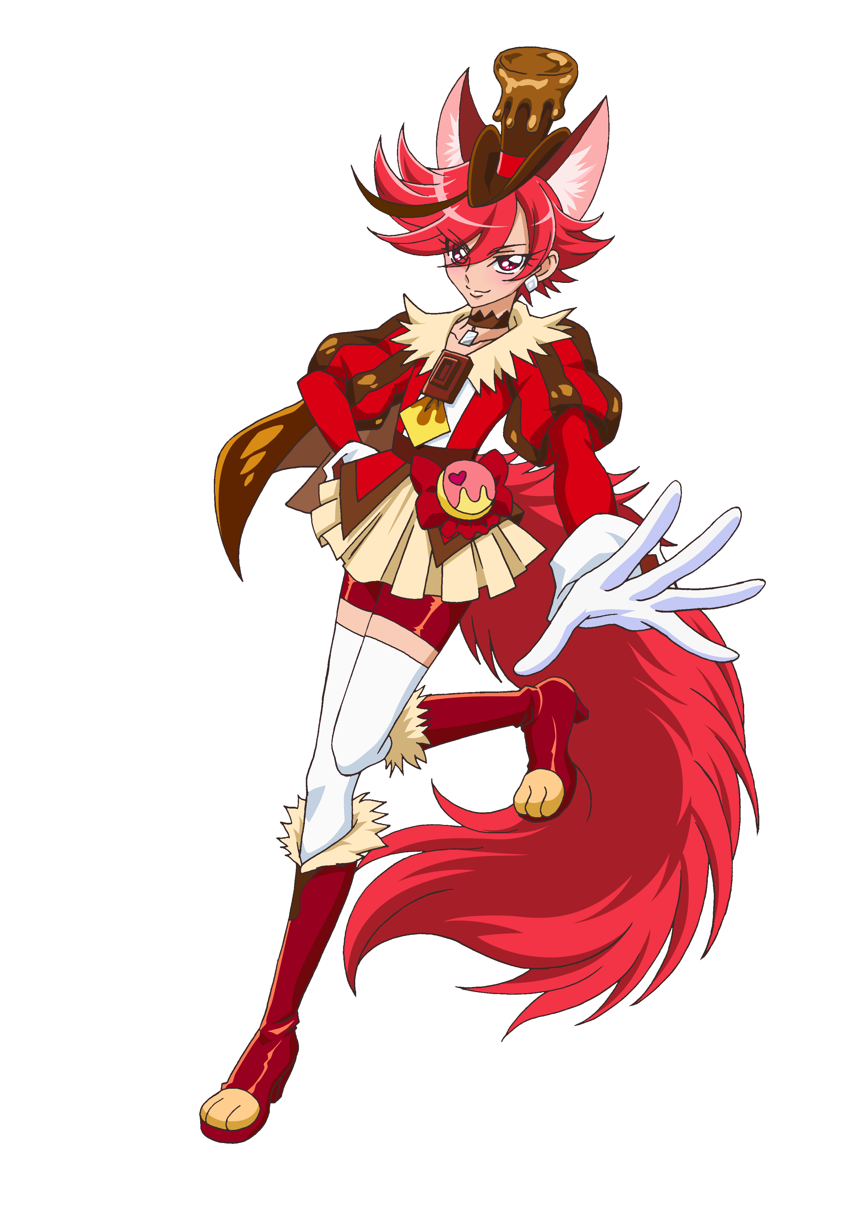 1girlanimal earsbootsbrown capebrown chokerbrown hatcapechokerdog earsdog tailextra earsfull bodygloveshatjacketjuliet sleeveslong sleeveslooking at viewermagical girlmulticolored hairpaw shoespleated skirtpuffy sleevesred bootsred eyesred hairred jacketred shortsshort hairshortssimple backgroundskirtsmilesolostandingstanding on one legstreaked hairtailthighhighstop hattransparent backgroundwhite gloveswhite thighhighs