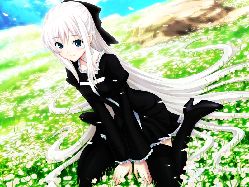 1girlblack dressblack thighhighsblue eyesblushbootsbowchokerdaydressdutch anglefemale focusflowerfrillsgrasshair bowhigh heelslong hairnatureon groundoutdoorsshoessittingskysmilesolothigh bootsthighhighsvery long hairwarizawhite hair
