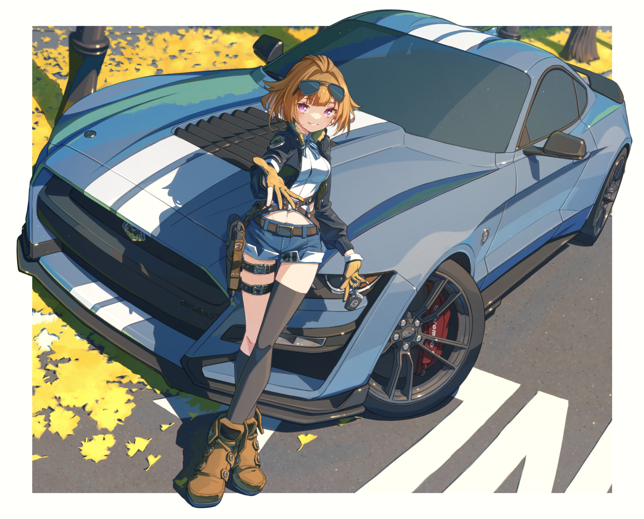 1girlasymmetrical legwearautumn leavesaviator sunglassesbeltblack glovesblack socksblack thighhighsblue ribbonbootsborderbreastsbrown bootsbrown haircropped jacketcrossed legsdenimdenim shortseyewear on headglovesgrizzly win maghair intakesholdingholding keyholsterjacketkeylamppostlarge breastsleaflong sleeveslooking at viewermedium hairmidriffopen clothesopen jacketoutdoorsoutstretched handpartially fingerless glovespurple eyesribbonshort shortsshortssmilesockssolostriped ribbonsunglassesthigh strapthighhighstreetwo-tone gloveswhite borderwhite ribbonyellow gloves