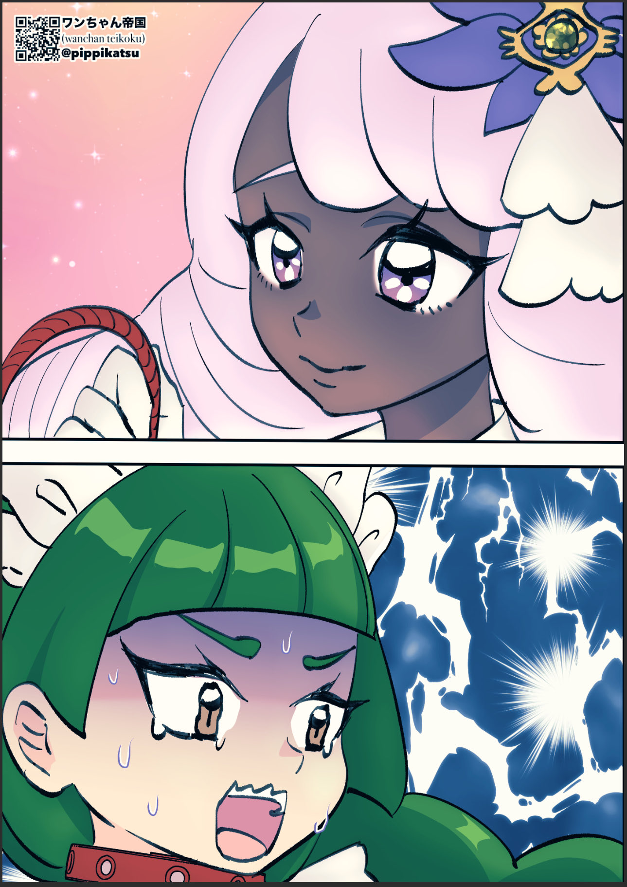 2girlsbrown eyescollardark skindark-skinned femalefascinatorgreen hairhair ornamentholdingholding leashleashlight smilelong hairmaidmaid headdressmultiple girlspartially shaded facepurple eyespurple hairscaredsweatsweatdroptearing uptearsvery dark skinwavy mouth