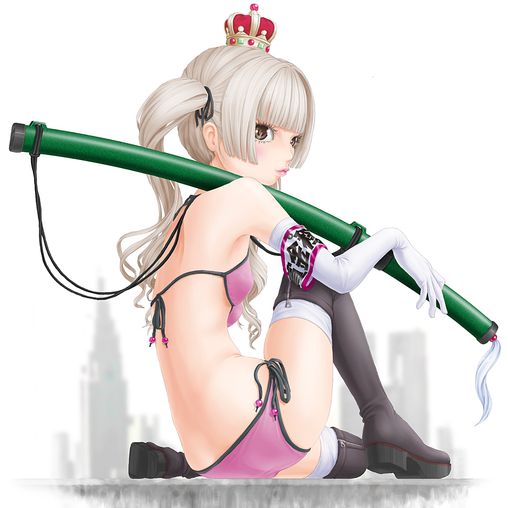1girlbikiniblonde hairbootsbrown eyescrownelbow glovesfemale focusflat chestgloveslong hairpink bikinipoutred crownsheathsheathedside-tie bikini bottomsoloswimsuitswordthigh bootsthighhighsweapon