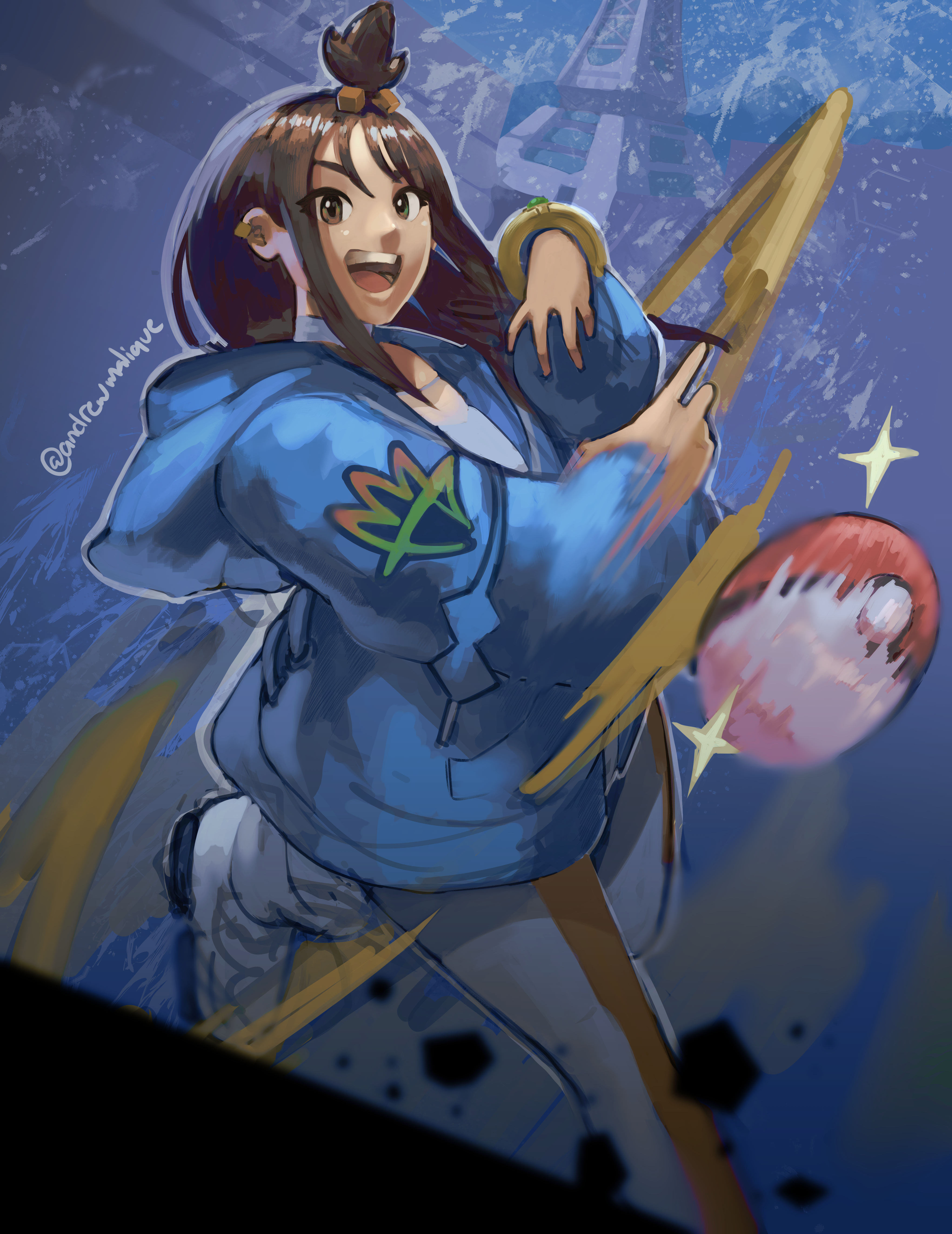 1girlartist nameblue backgroundblue jacketbraceletbrown eyesbrown haircowboy shotcube hair ornamentdrawstringdynamic poseearcliphair ornamenthoodhood downhooded jacketjacketjewelryleg uplooking at viewermotion bluropen mouthpantspoke ballpoke ball (basic)shoessmear framesneakerssolosparklethrowingthrowing poke balltight clothestopknottowerwhite pantswhite shoesyoga pants