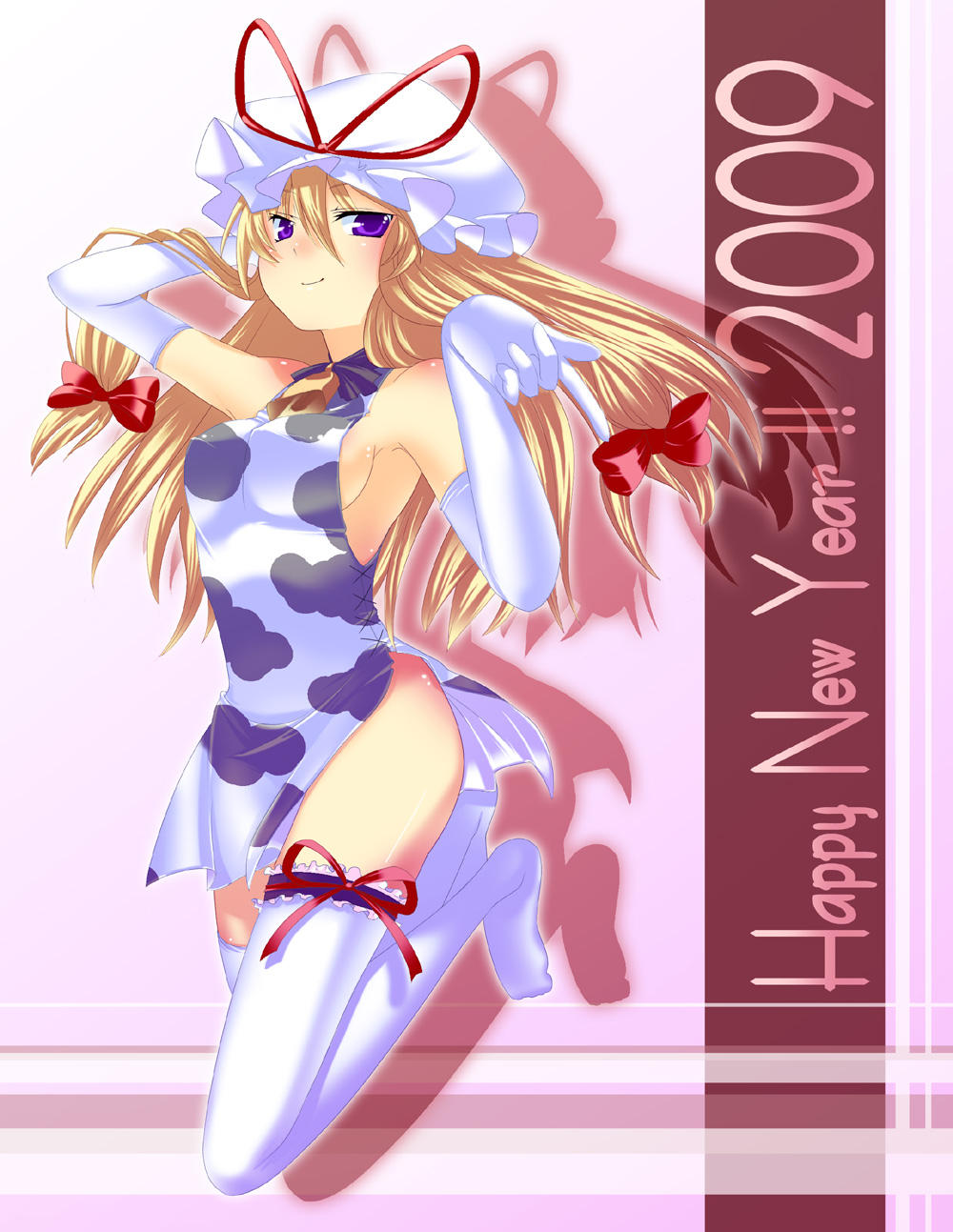 1girlalternate costumeanimal printblonde hairblushbowbreastscow printelbow glovesfemale focusgloveshair bowhatlong hairmedium breastsnew yearpurple eyesribbonsideboobsmilesolothighhighswhite gloveswhite thighhighs