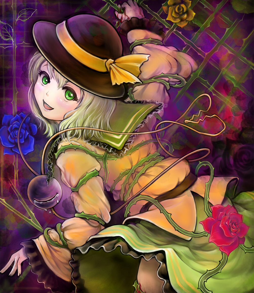 1girlbloodblue flowerblue rosebroken heartfemale focusflowergreen eyesheartred flowerred roserosesolotearsthornsyellow floweryellow rose