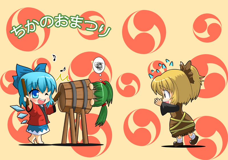 3girlsbarefootblonde hairblue eyesblue hairbowbucketchibidrumfemale focusgreen hairhair bobbleshair bowhair ornamentin bucketin containerinstrumentmultiple girlsone eye closedrobeshort hairtaiko drumtwintailswingswink