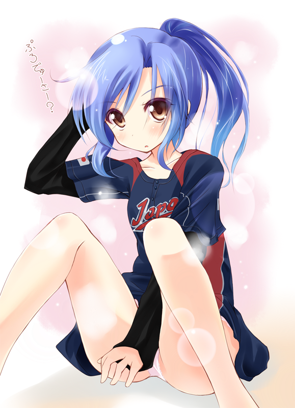 00s1girlalternate hairstylearm behind headbare legsbaseball uniformblue hairblushbrown eyesclothes writingfemale focuslegslong sleevesno pantspantiespantyshotponytailsittingsolosportswearunderwear