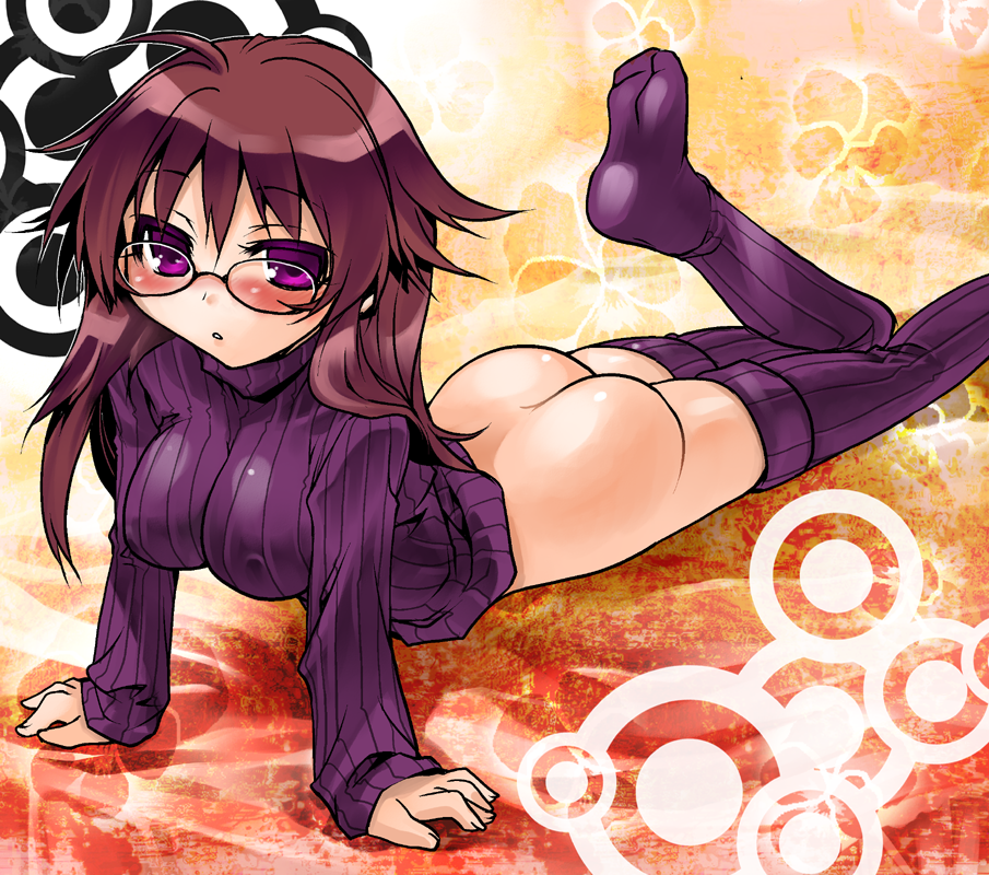 1girlassblushbottomlessbreastsbrown haircovered erect nipplesfeetfemale focusglasseslong hairlooking at viewernaked sweaterno pantiespurple eyessolosweaterthighhighs